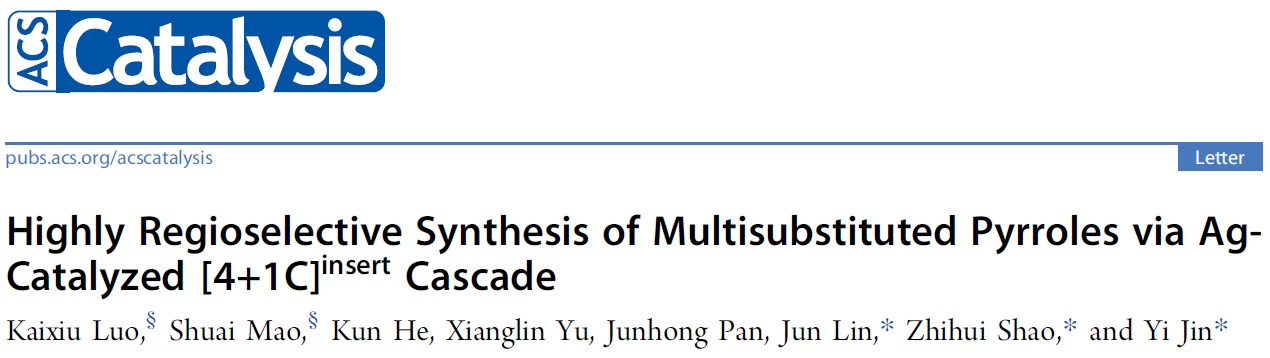 近日,Beat365唯一官方网站自然资源药物化学教育部重点实验室/化学科学与工程学院林军、金毅教授团队、邵志会教授团队、以及西安交通大学毛帅副教授共同合作,发展了一种新颖的银催化[4+1C]插入串级合成方法,高效、高区域选择性和高化学选择性的合成了一系列结构多样性吡咯类化合物。研究成果在催化领域顶级期刊《ACS Catalysis》(最新IF为12.221)上在线发表。该论文的第一作者为2018级博士研究生罗开秀,毛帅副教授为共同第一作者,通讯作者为金毅教授、邵志会教授和林军教授。Beat365唯一官方网站为第一通讯作者单位。