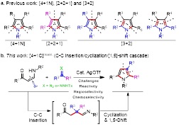 多取代吡咯是一类具有代表性的N-杂五元环骨架,广泛应用于医药、材料及农药领域。传统的吡咯合成策略通常是[4+1N]、[3+2]和[2+2+1]偶联环化反应,其中包括经典的Knorr、Pann-Knorr和Hantzsch等路线。近年来也有文献报道基于传统策略的金属催化多组分偶联环化反应合成多取代吡咯类化合物的方法,但这些方法都有一定的局限性。比如吡咯环构建大多需要对反应底物进行预官能活化,导致合成需要多步反应来完成,总收率较低,不具备原子经济性等。因此,发展新颖的反应策略,设计简捷高效并具有多取代选择性的吡咯化合物制备方法是有机合成方法学领域极具挑战的研究课题。